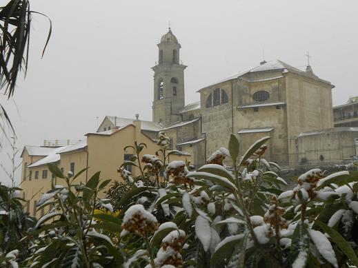La chiesa della Madonnetta, che ieri avete visto baciata dal sole, oggi si presentava così, spolverata di bianco, in questa sera d’inverno, sotto la neve che ancora cade.