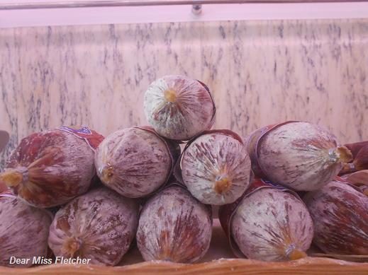 Ecco il marmo bianco della macelleria Cabella e in esposizione una sfilza di salami pronti all’acquisto, anche questa in qualche modo è poesia.