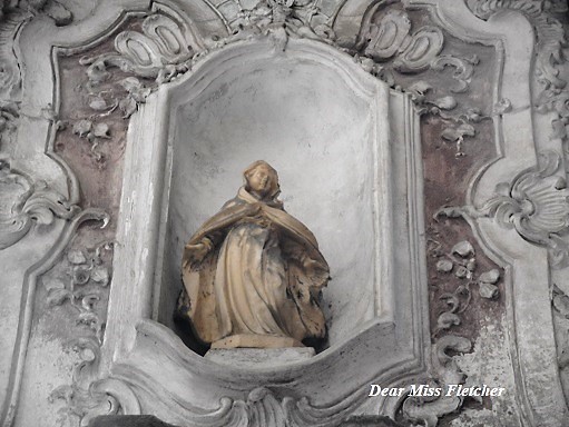 Adagiata su una forma di conchiglia,e in una nicchia particolare,anche il muro come dici tu è particolare,offrendo ai nostri sguardi una costruzione a merlatura