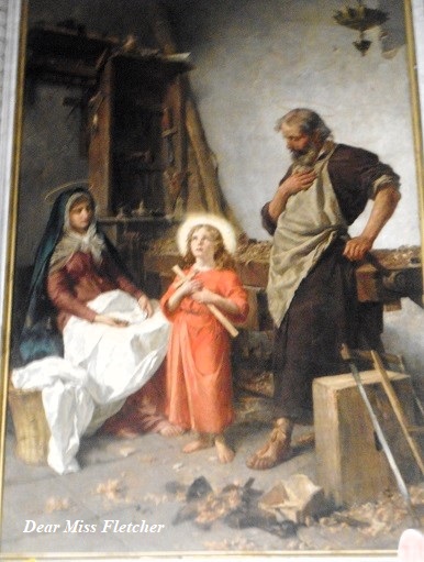 Si notano gli attrezzi da falegname di Giuseppe e i trucioli di legno frutto del suo lavoro, Maria siede come una mamma amorevole e paziente.