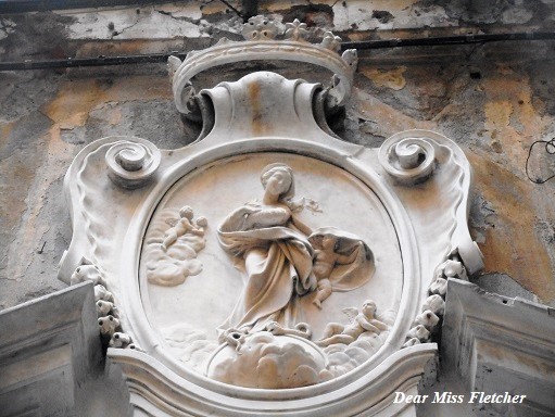 Si staglia lieve e mistica nel marmo nel quale è scolpita la figura gentile della Madonna Immacolata in uno dei nostri caruggi più amati.