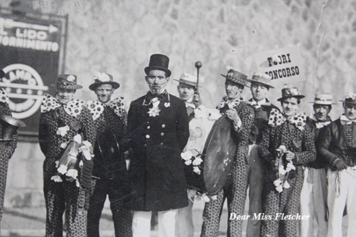 Ah, il direttore della banda poi è un tale tutto serio e compito, si può certo dire poi che si distingue tra gli altri, infatti porta la giacca scura e il cilindro sulla testa.