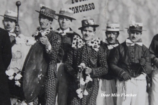 Vestiti di tutto punto con le braghe bianche, la paglietta e il grosso fiocco colorato sul davanti.